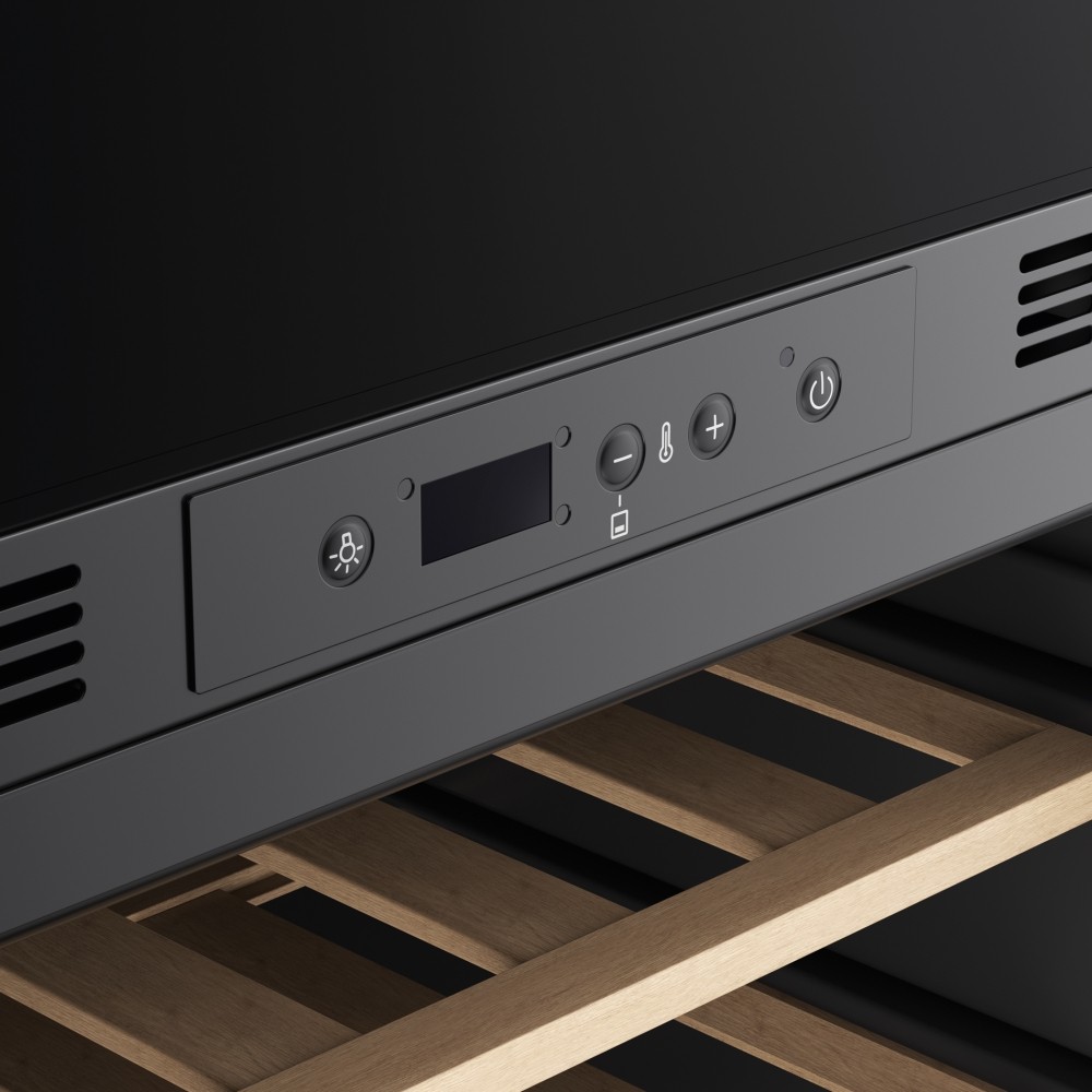 Vitrină vin, spațiul perfect pentru depozitarea vinului in două zone la temperaturi reglabile între 4°C și 18°C și o ușă din sticlă colorată pentru o mai mare protecție împotriva luminii și o utilizare mai eficientă a energiei, display digital, capacitate 36 sticle.